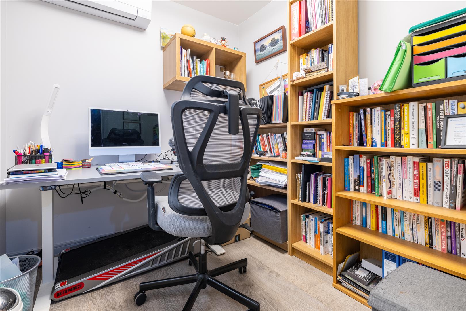 The property opens with a welcoming entrance hall leading to a versatile study—complete with an air-conditioning unit—ideal for home working. The spacious living room offers a comfortable setting for relaxation, while the impressive kitchen/dining room features integrated appliances and double doors that open directly onto the rear garden. A separate utility room provides additional convenience and functionality.