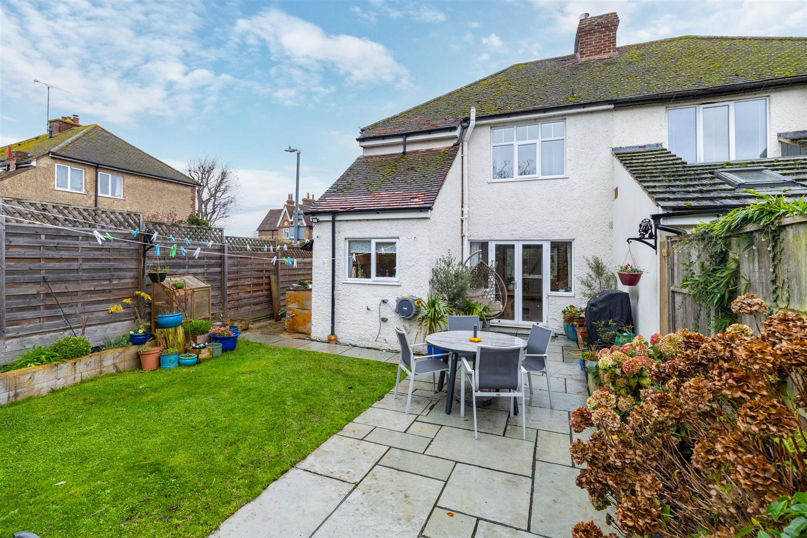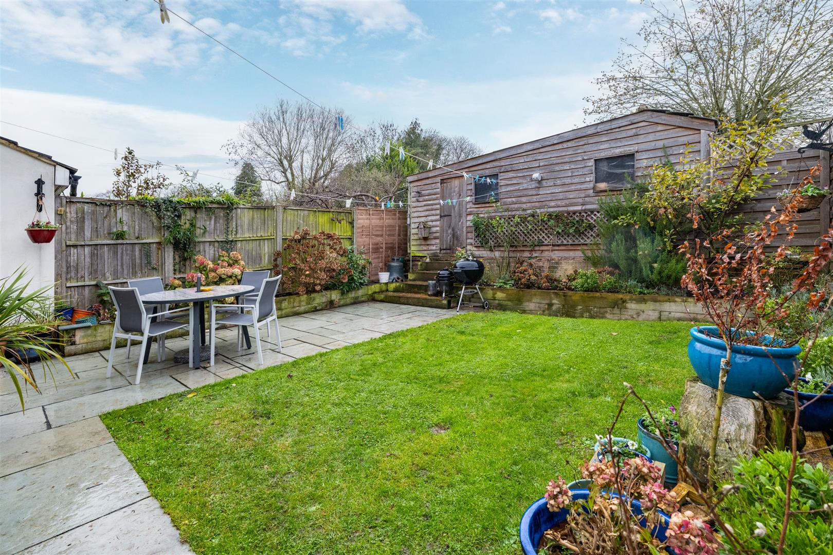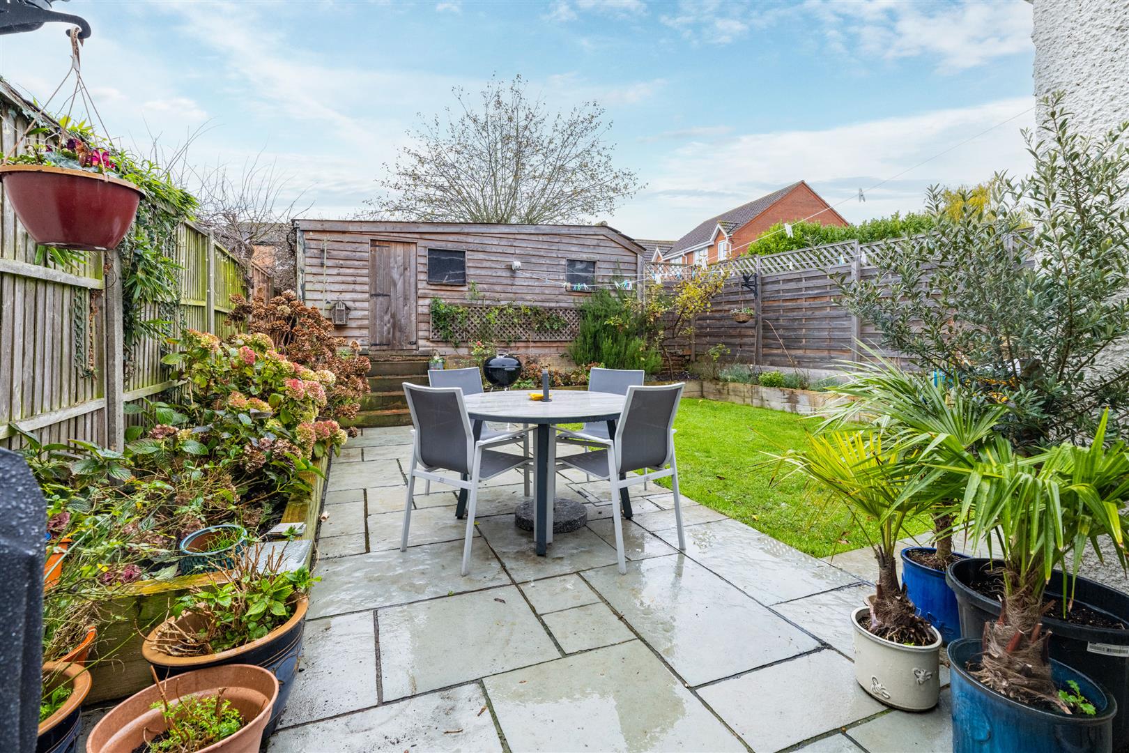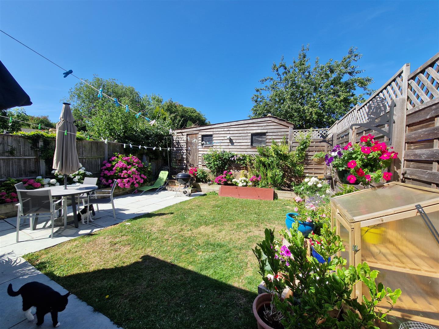 The well-established rear garden has been thoughtfully maintained and includes a newly laid patio. A substantial shed accessible from the rear of the property provides excellent storage and is large enough to accommodate a car. The garden also boasts a fully plumbed dog bath, adding a unique touch of practicality.