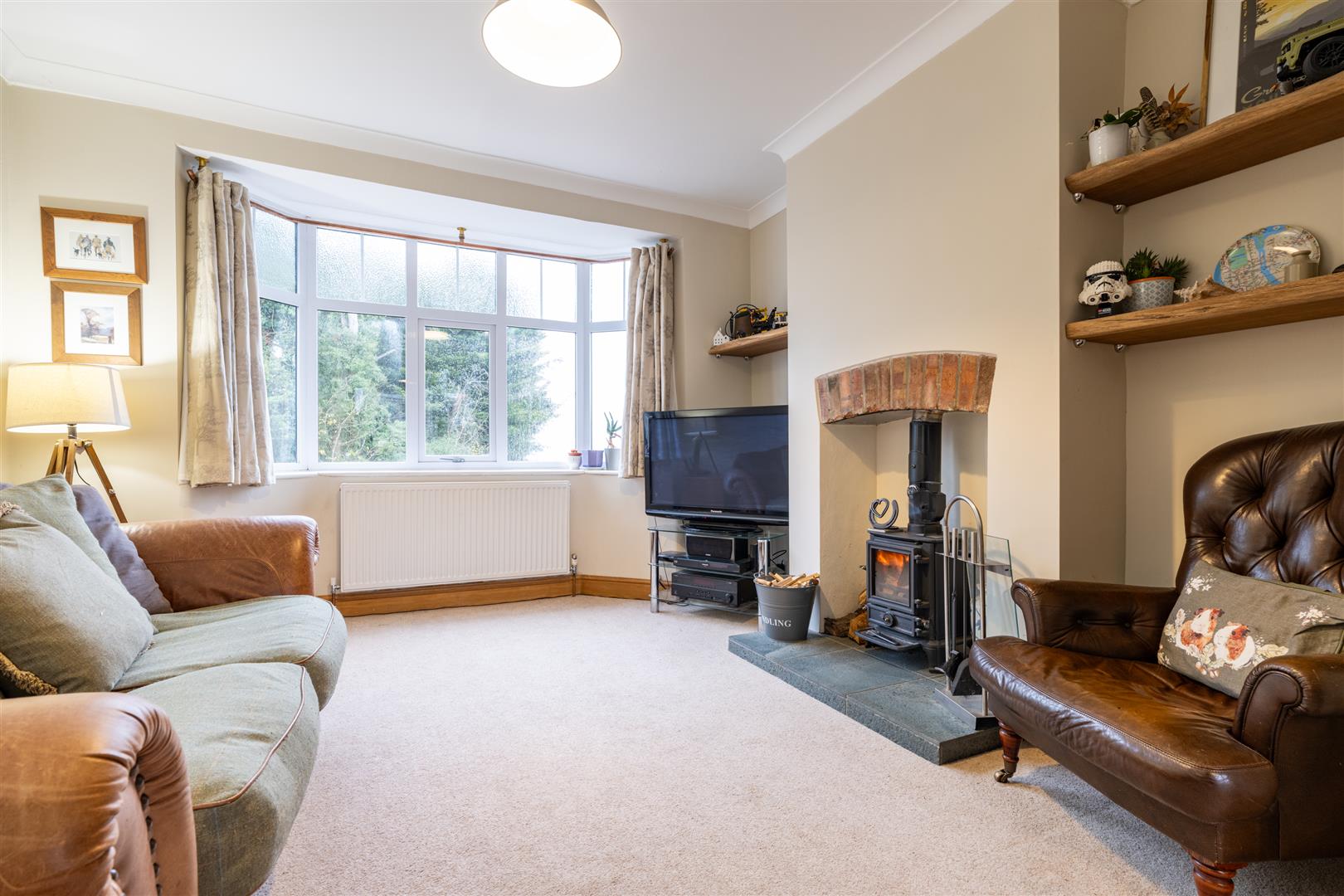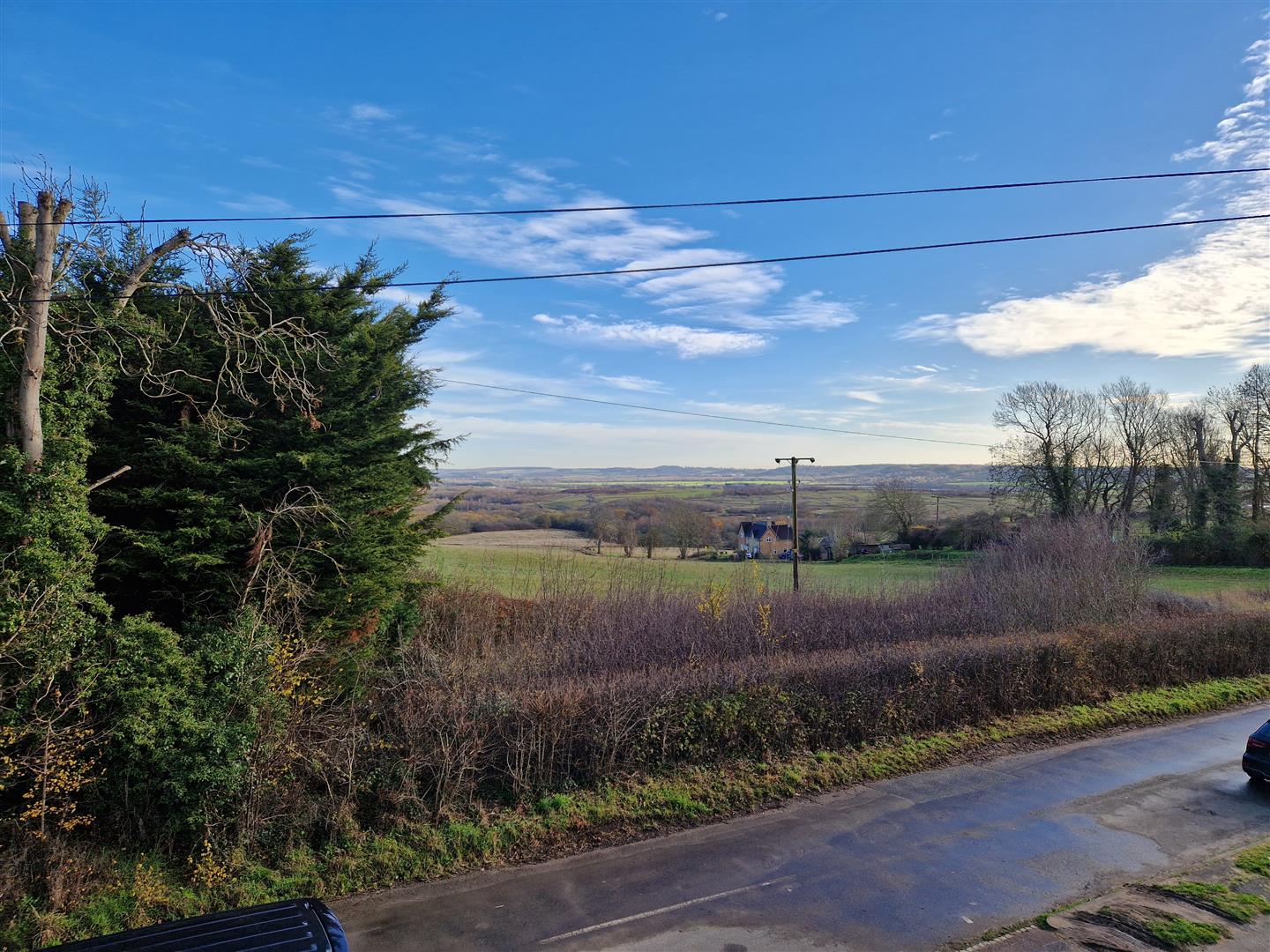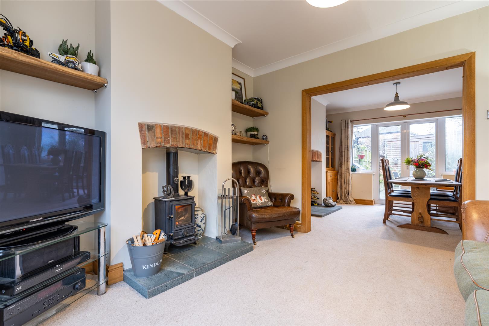 The entrance hall leads into a spacious living/dining room, where a large bay window showcases the breath taking Thrift views. A cosy log burner adds warmth and charm, perfect for those winter evenings. The separate dining area provides an ideal space for entertaining, with double doors opening onto the garden.